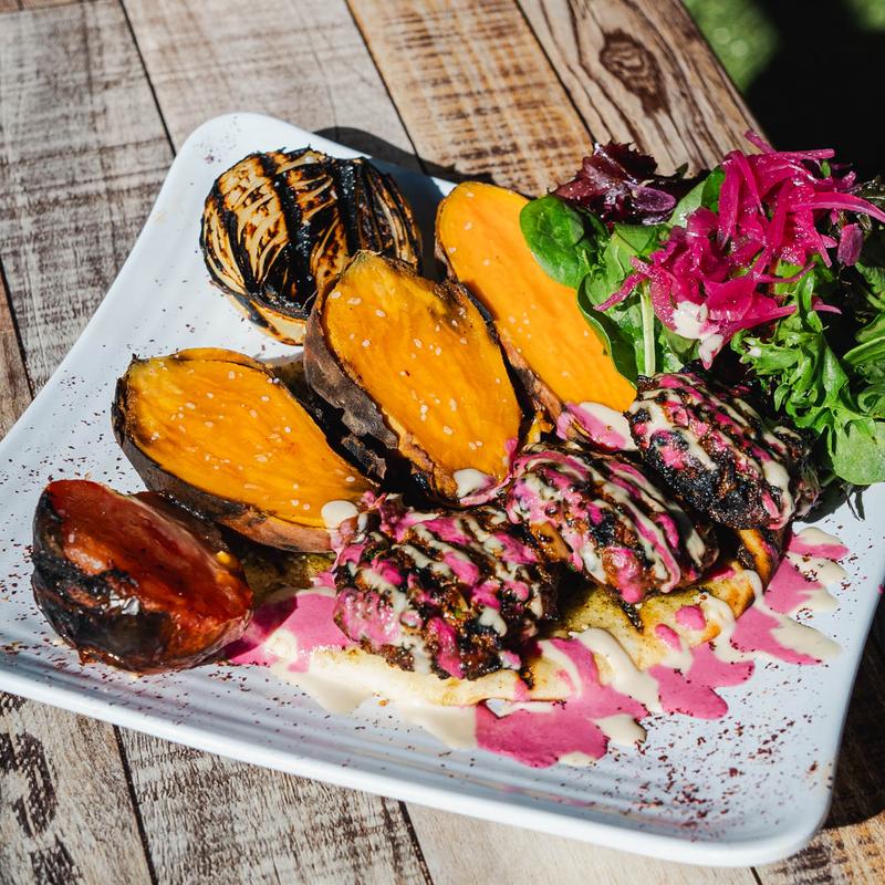Served with grilled vegetables, one side, and tahini amba sauce.